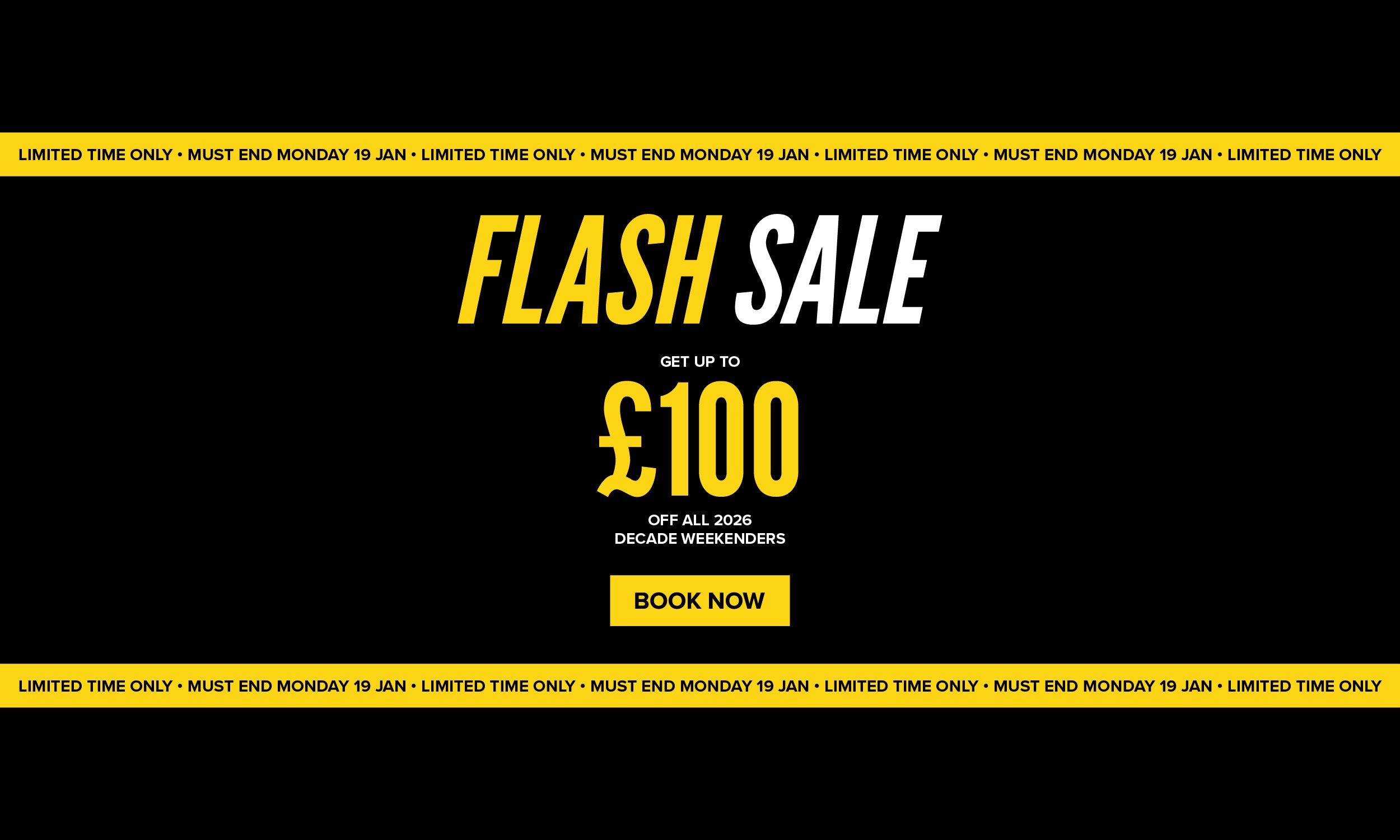 Your weekend just got even better because… our Flash Sale has landed! For a limited time only, save up to £100 on ALL Decade Weekenders. Big tunes. Big savings. Big Weekenders.